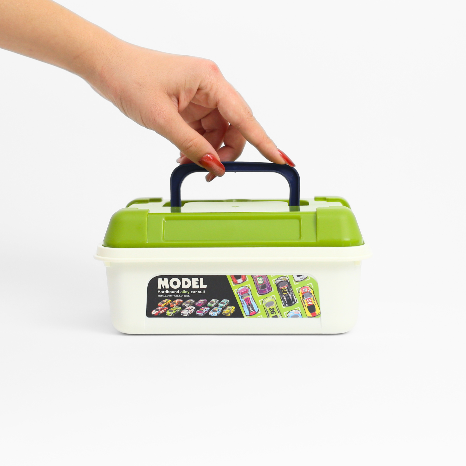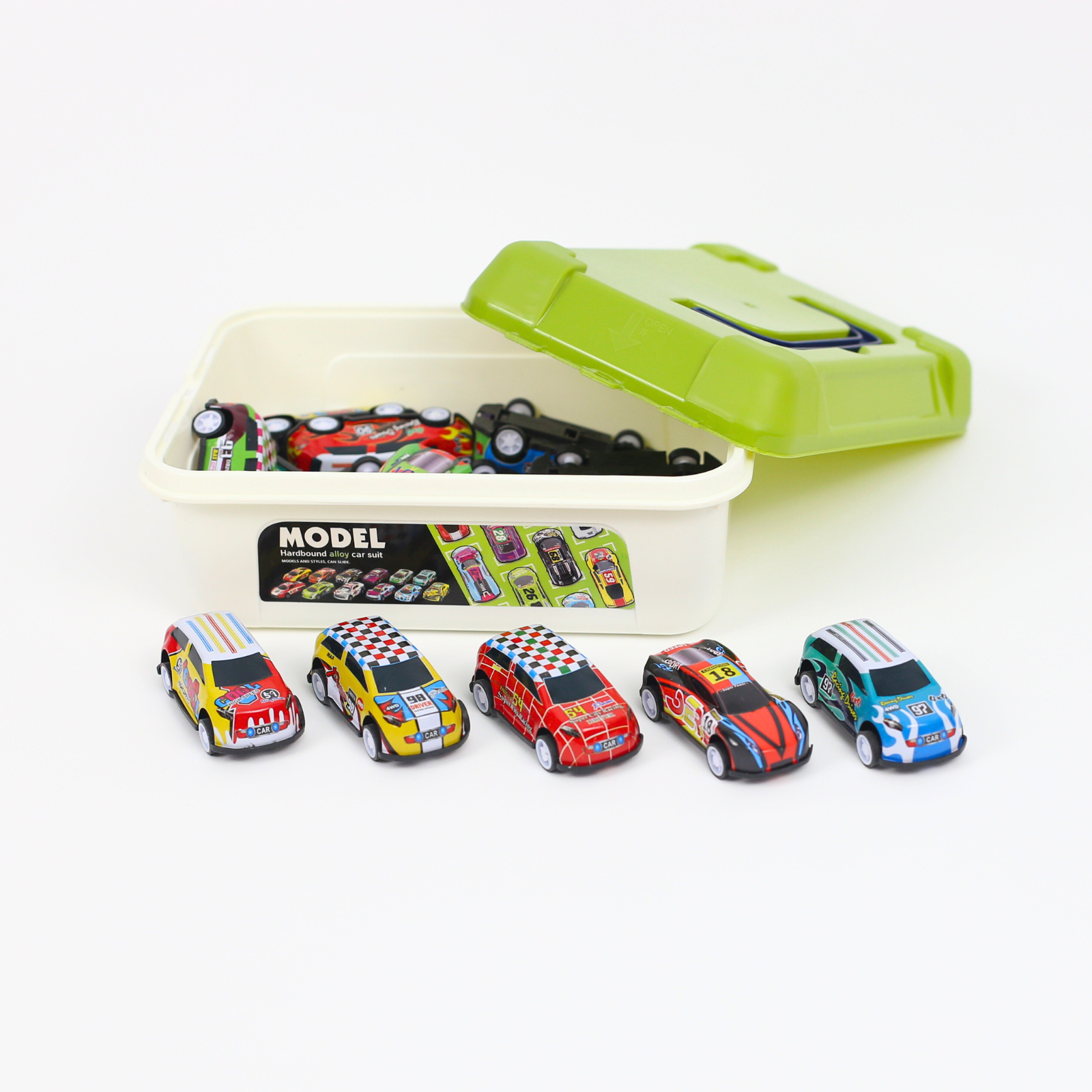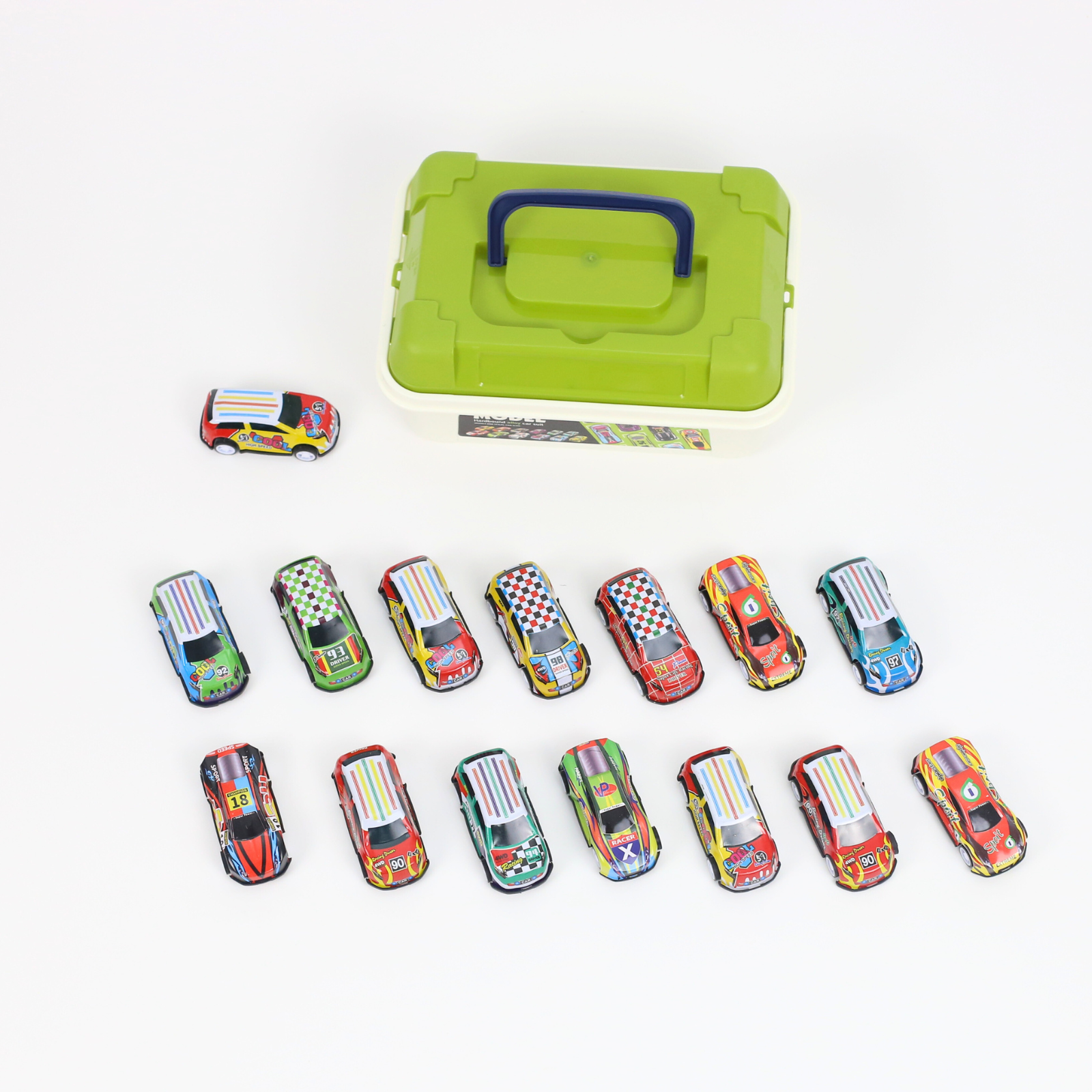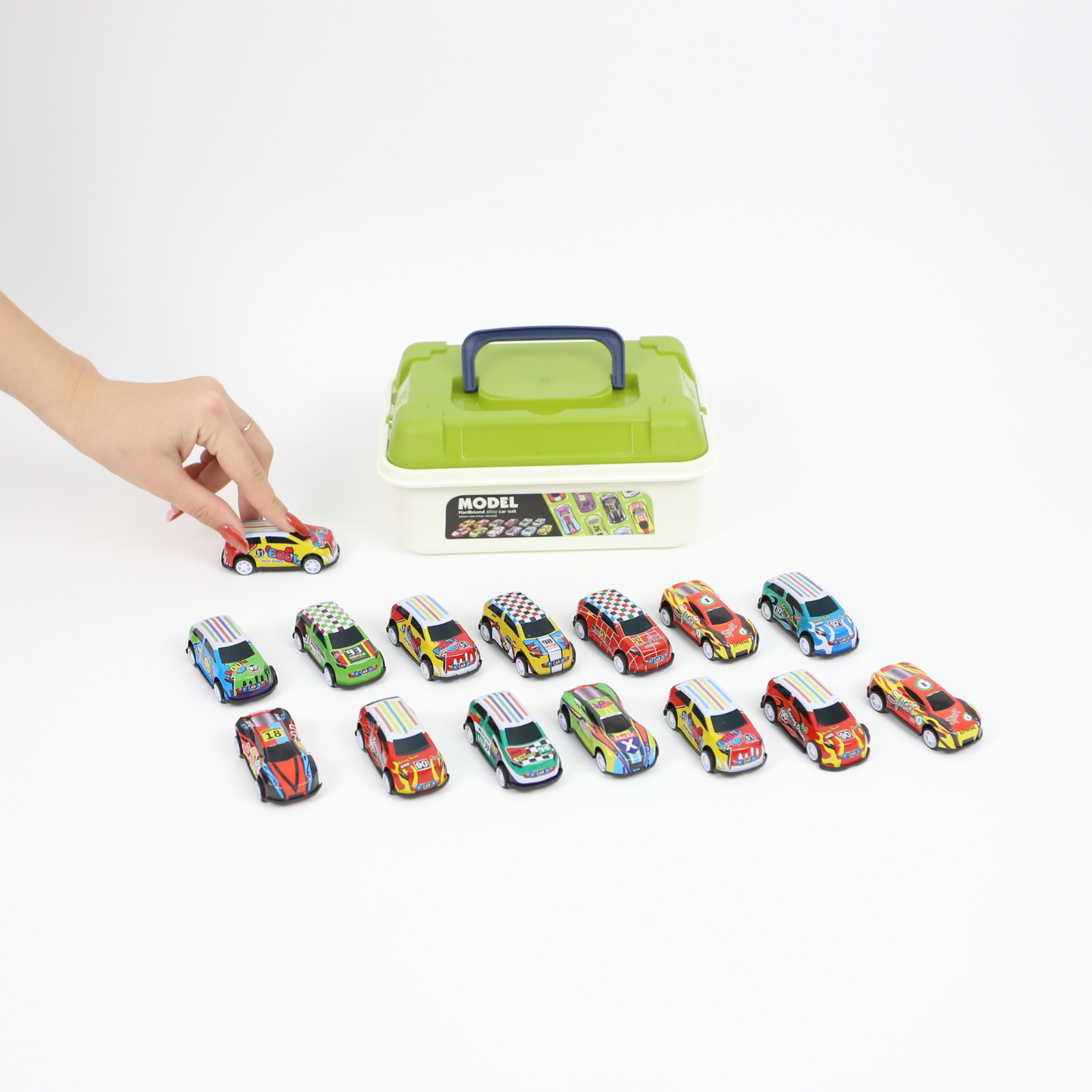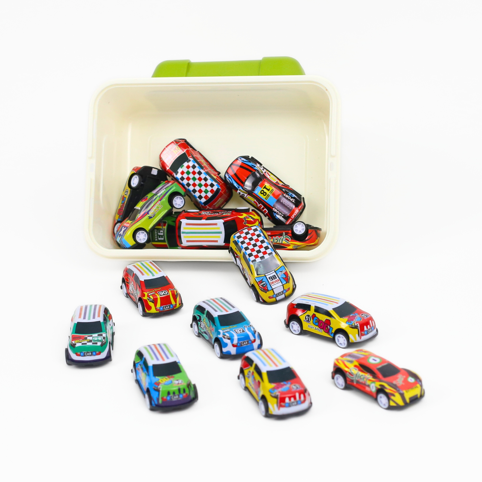 Mașinuțele oferă o experiență de joacă variată — de la curse improvizate până la jocuri de imaginație — și sunt concepute pentru a rezista utilizării frecvente. Cutia din plastic, dotată cu capac verde și mâner, facilitează organizarea și transportul setului, menținând mașinuțele în siguranță și la îndemână.