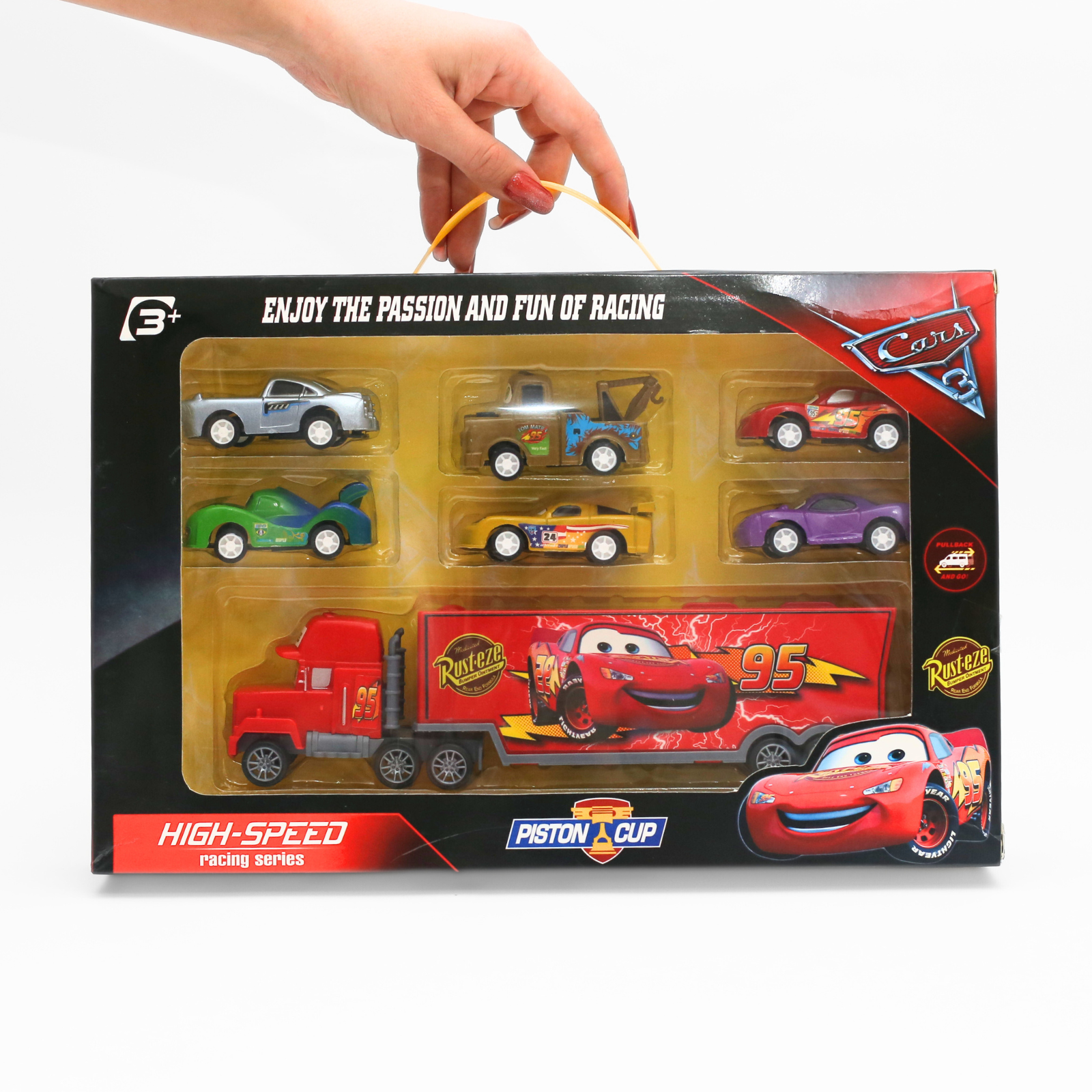 Camionul funcționează și ca spațiu de depozitare, astfel încât mașinuțele pot fi încărcate, transportate și păstrate în siguranță după fiecare cursă. Copiii pot recrea scene din film, pot organiza competiții rapide sau pot inventa propriile povești pline de acțiune.